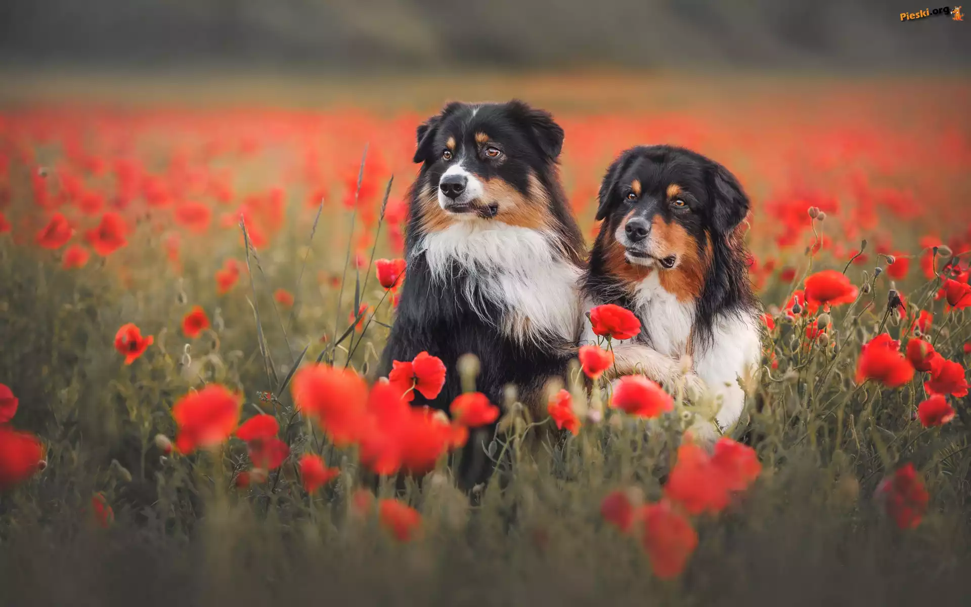 Maki, Psy, Owczarki australijskie, Dwa, Czerwone, Kwiaty, Pieski