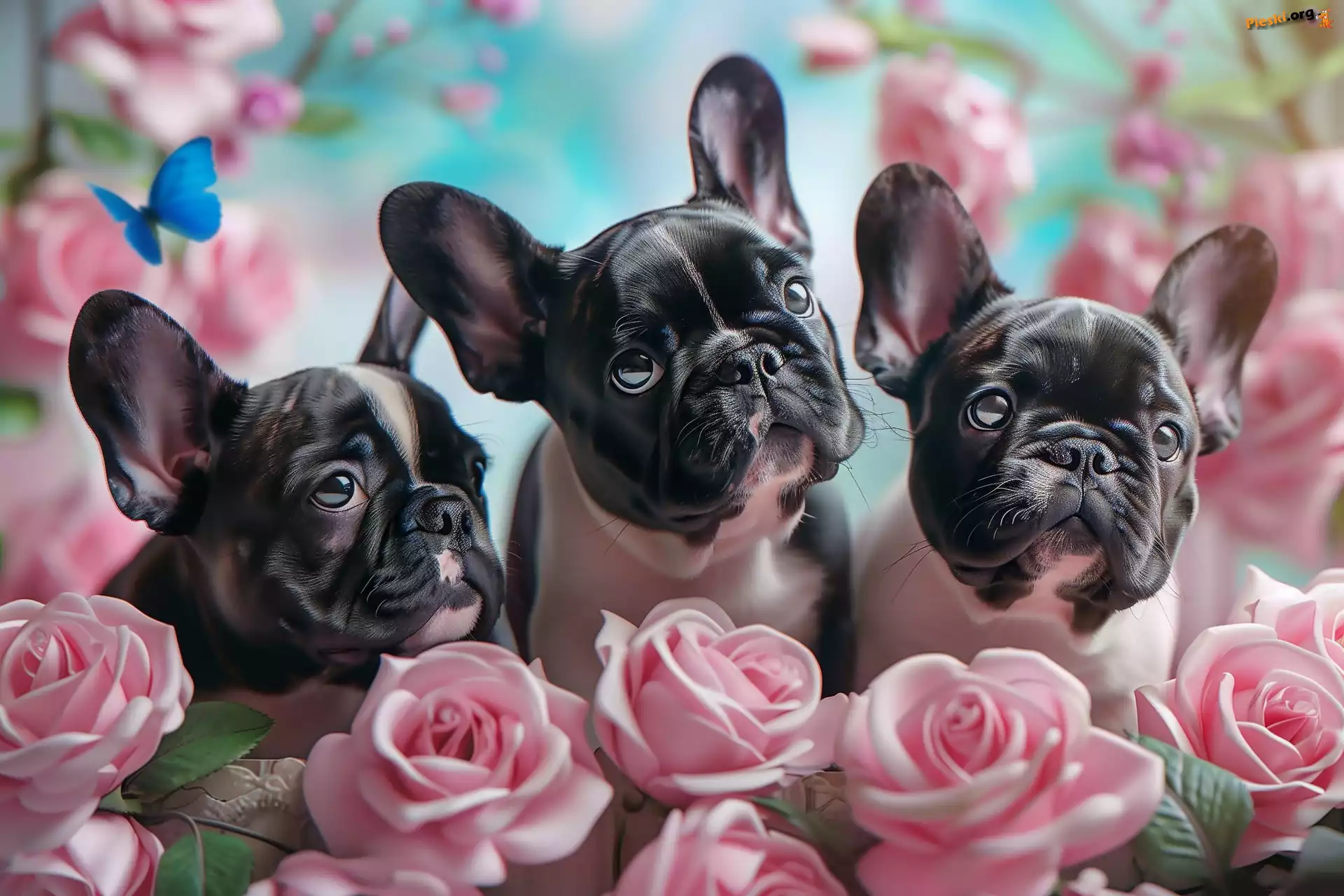 Grafika, Trzy, Psy, Buldog francuski, Kwiaty, Róże, Pieski