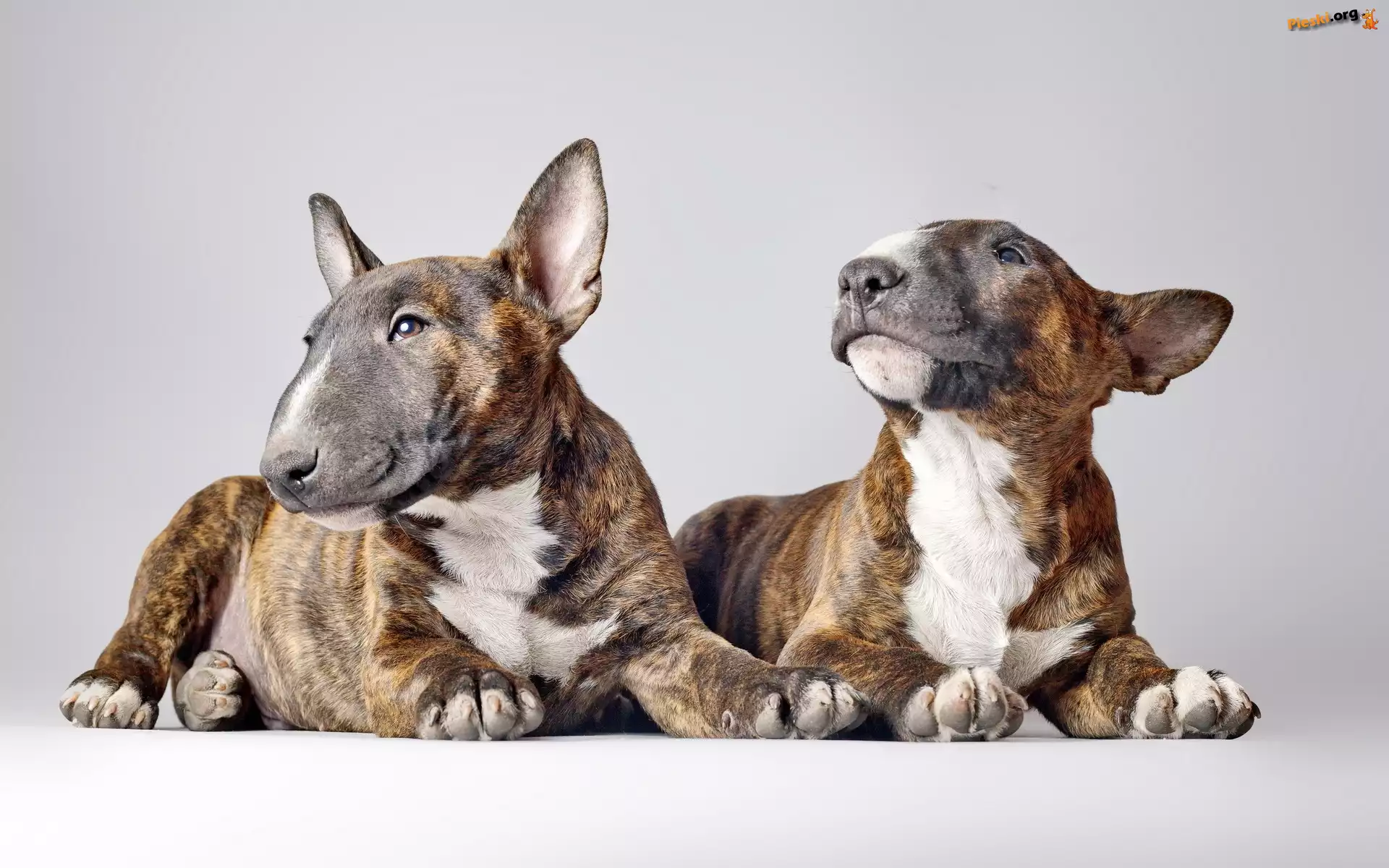 Ściółka, Bulterier, Pies, Pień, Las Pies, Bulterier, Dywan Bulteriery Biały, Bulterier, Trawnik Pies, Bulterier Kwiaty, Pies, Bulterier, Ścieżka Pień, Bulterier, Pies, Skok, Kłoda Język, Bulterier, Biały, Głowa, Łata Biały, Bulterier