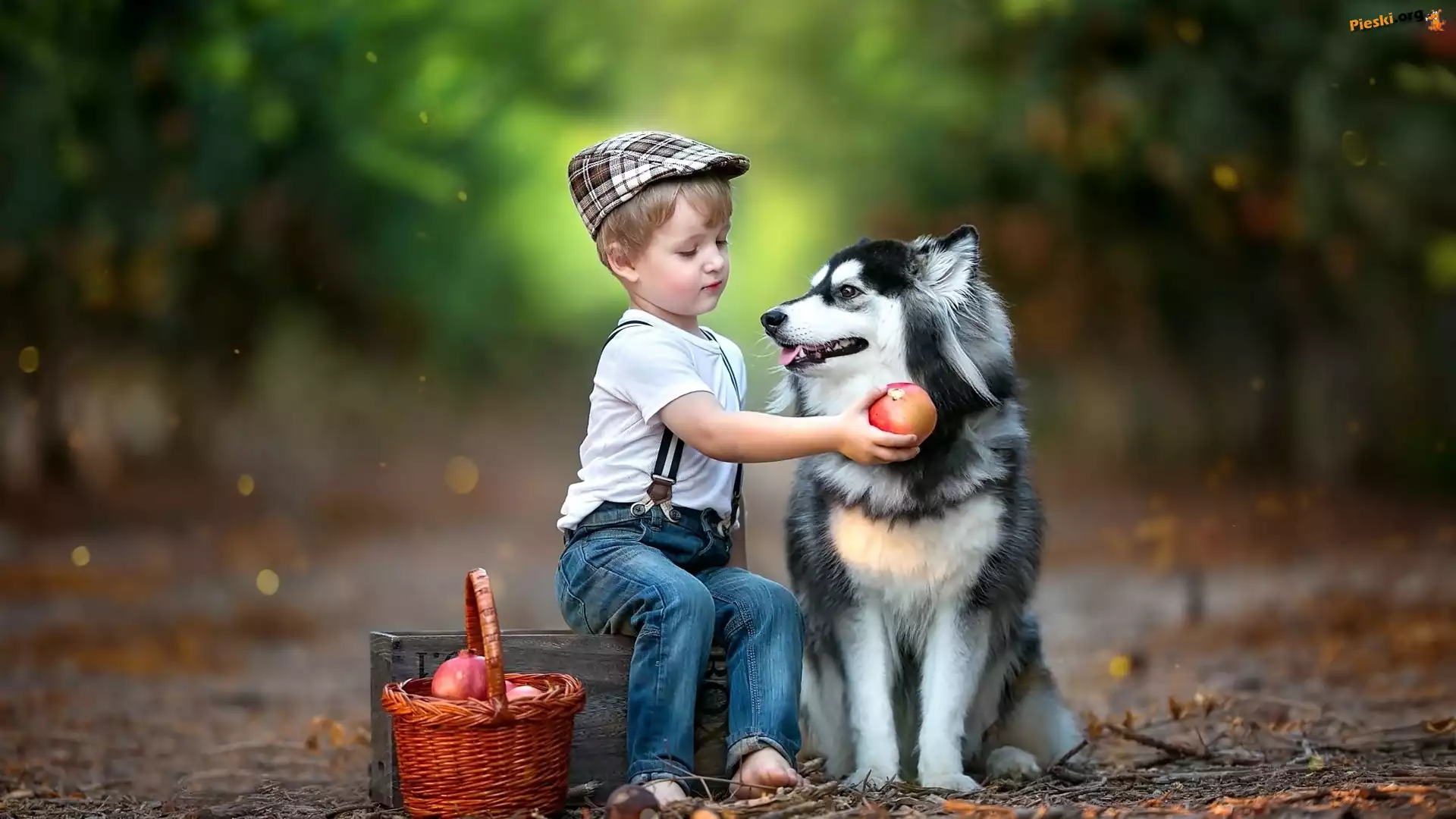 Owoce, Chłopiec, Droga, Siberian husky, Pies, Koszyk, Las, Pieski