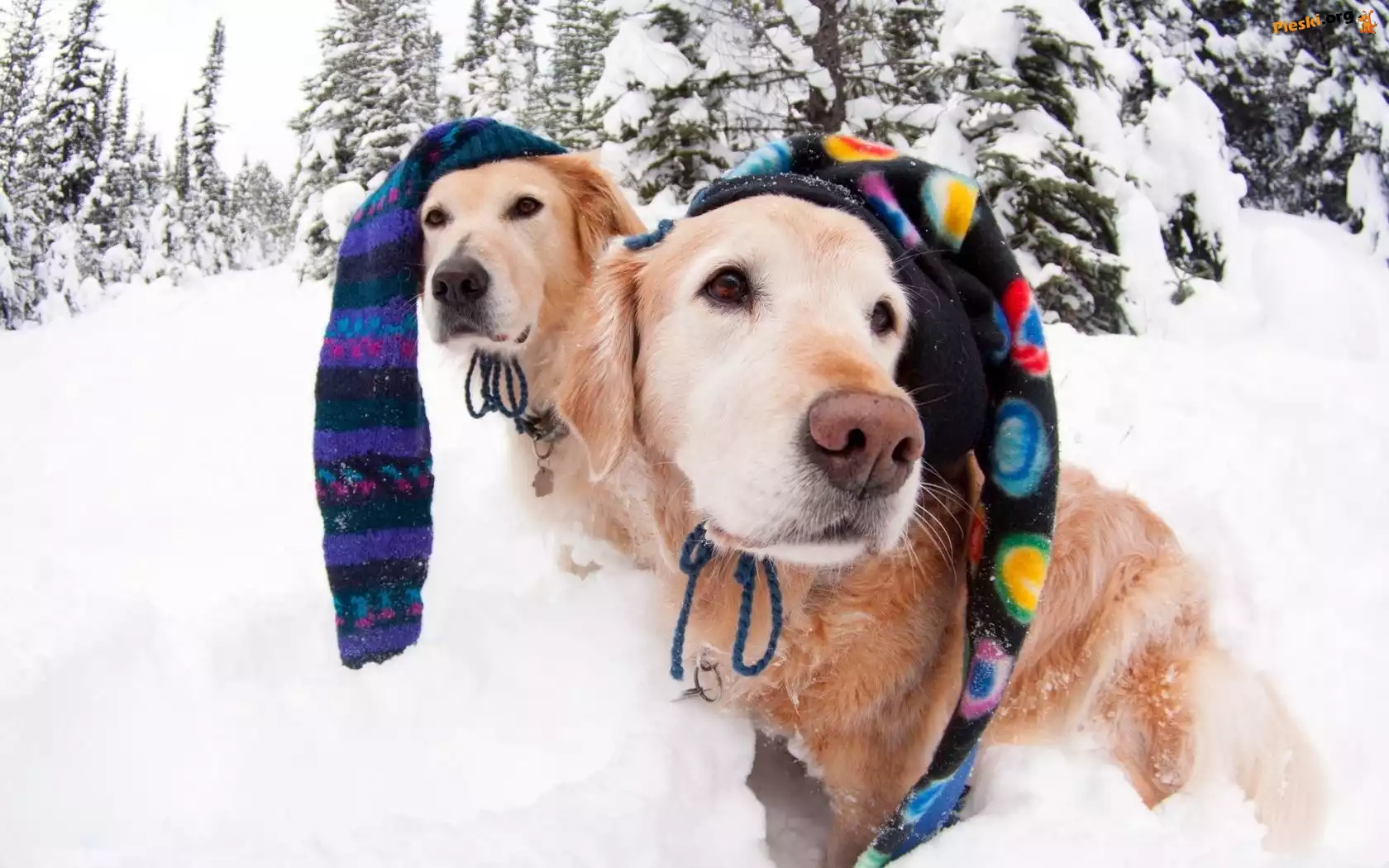 Czapki, Goldeny, Dwa, Kolorowe, Zima, Pieski