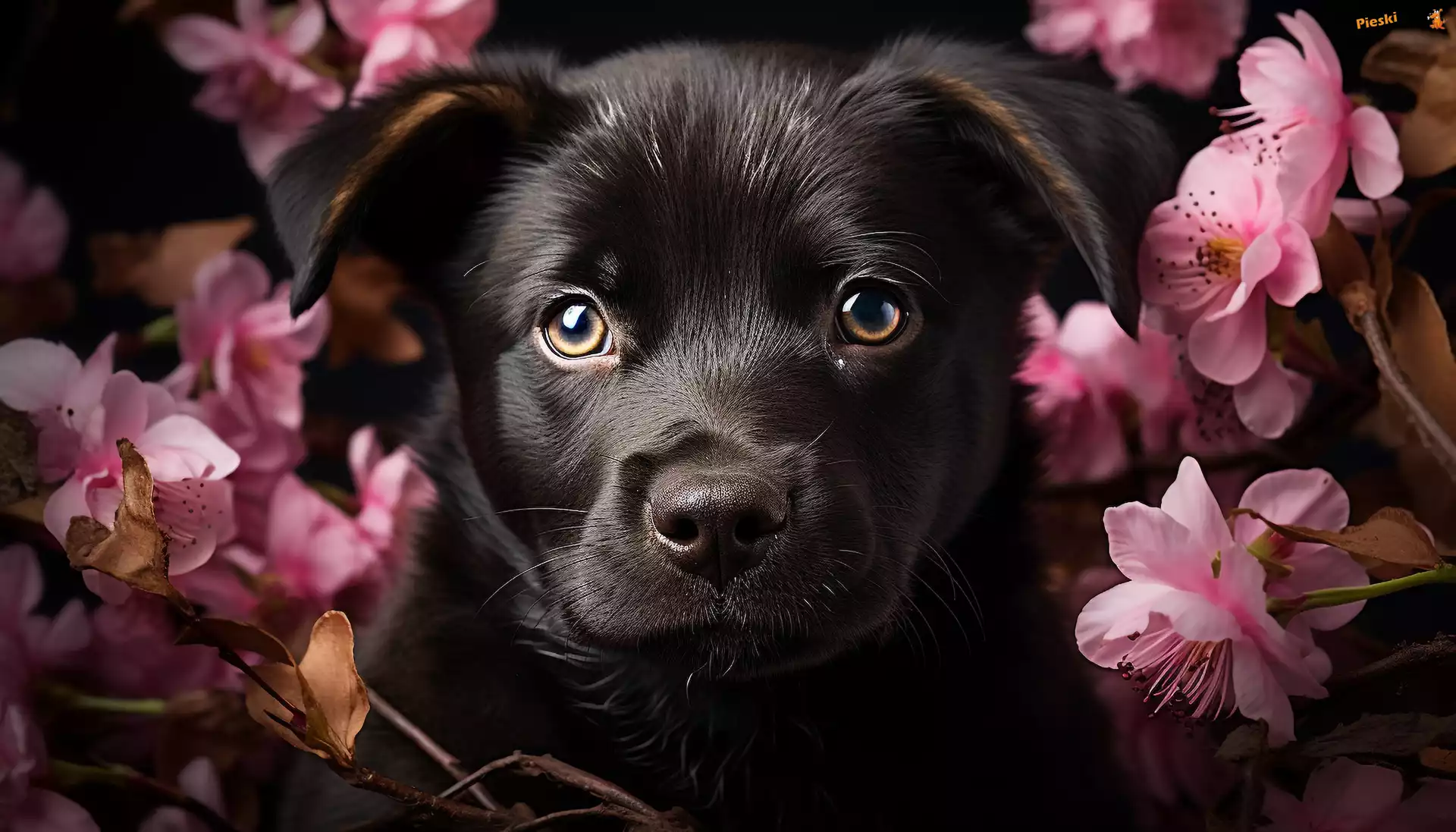 Kwiaty, Szczeniak, Pies, Czarny, Pieski