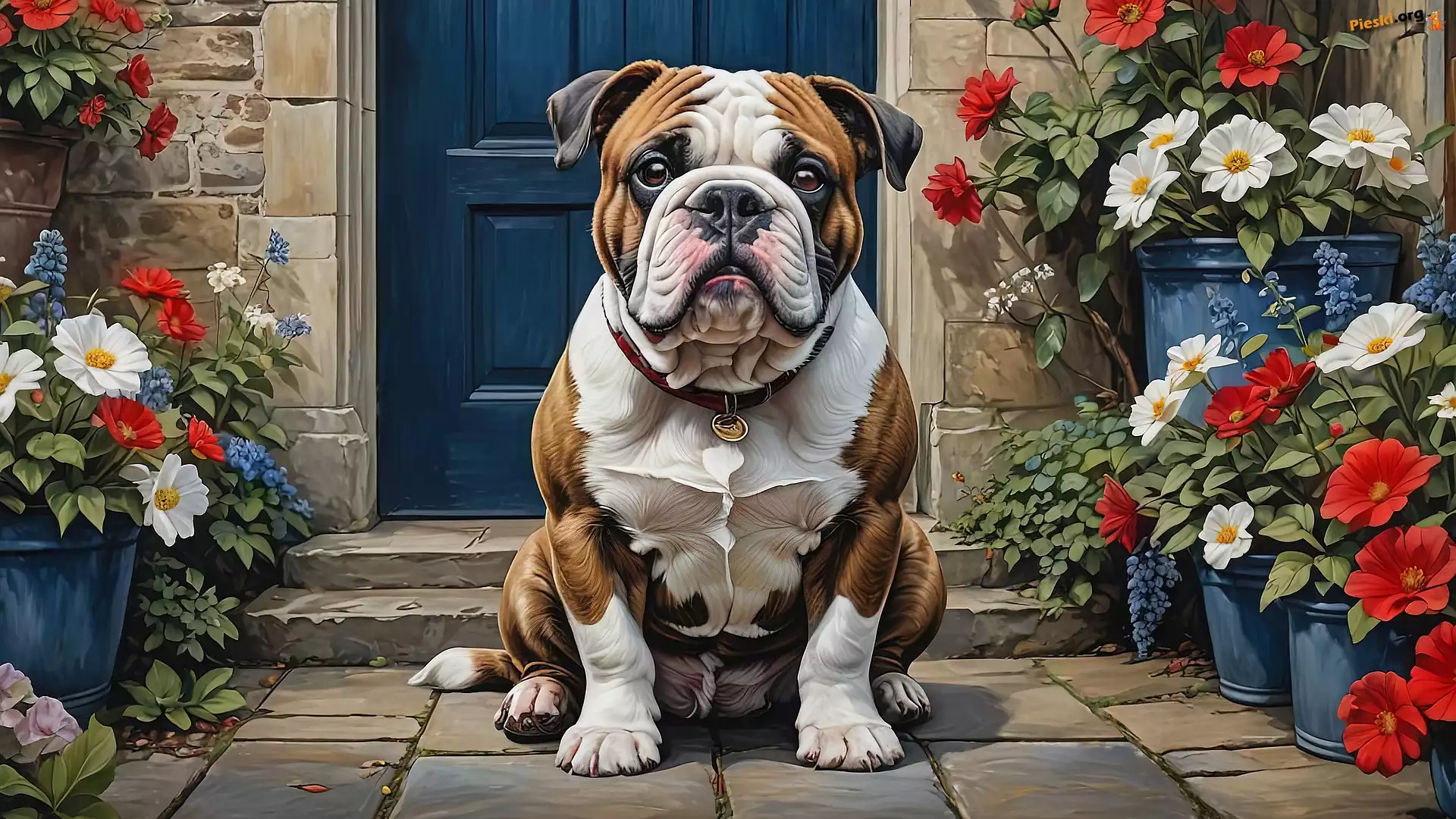 Kwiaty, Grafika, Pies, Dom, Buldog angielski