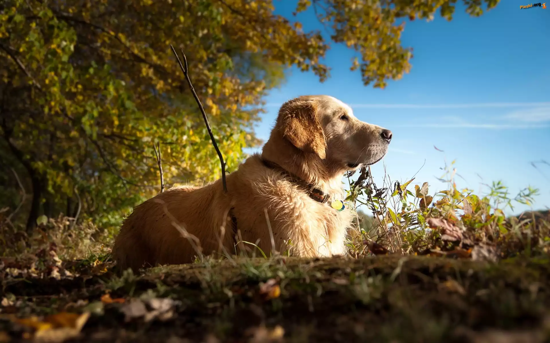 Golden Retriever, Spacer, Las, Pieski