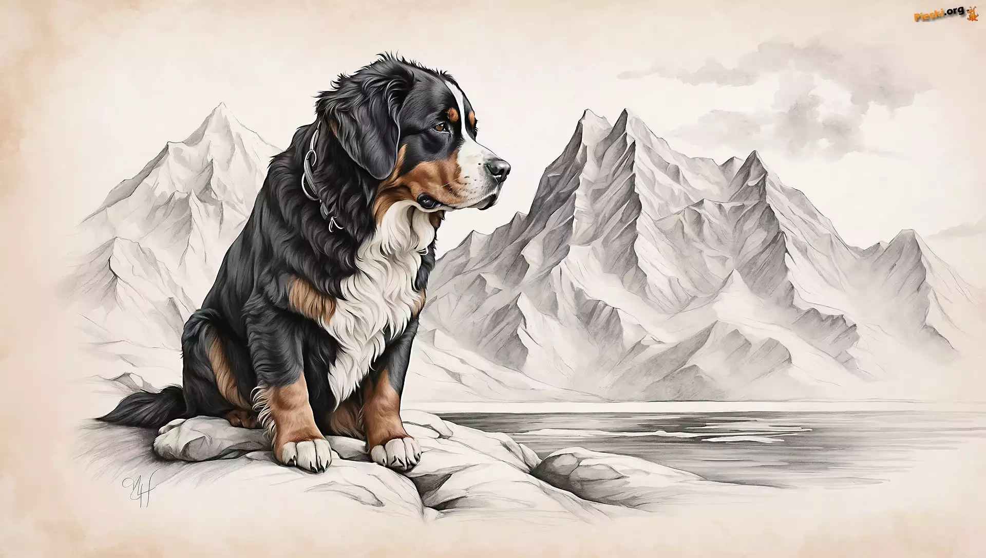 Zima, Rysunek, Pies, Góry, Berneński pies pasterski, Pieski