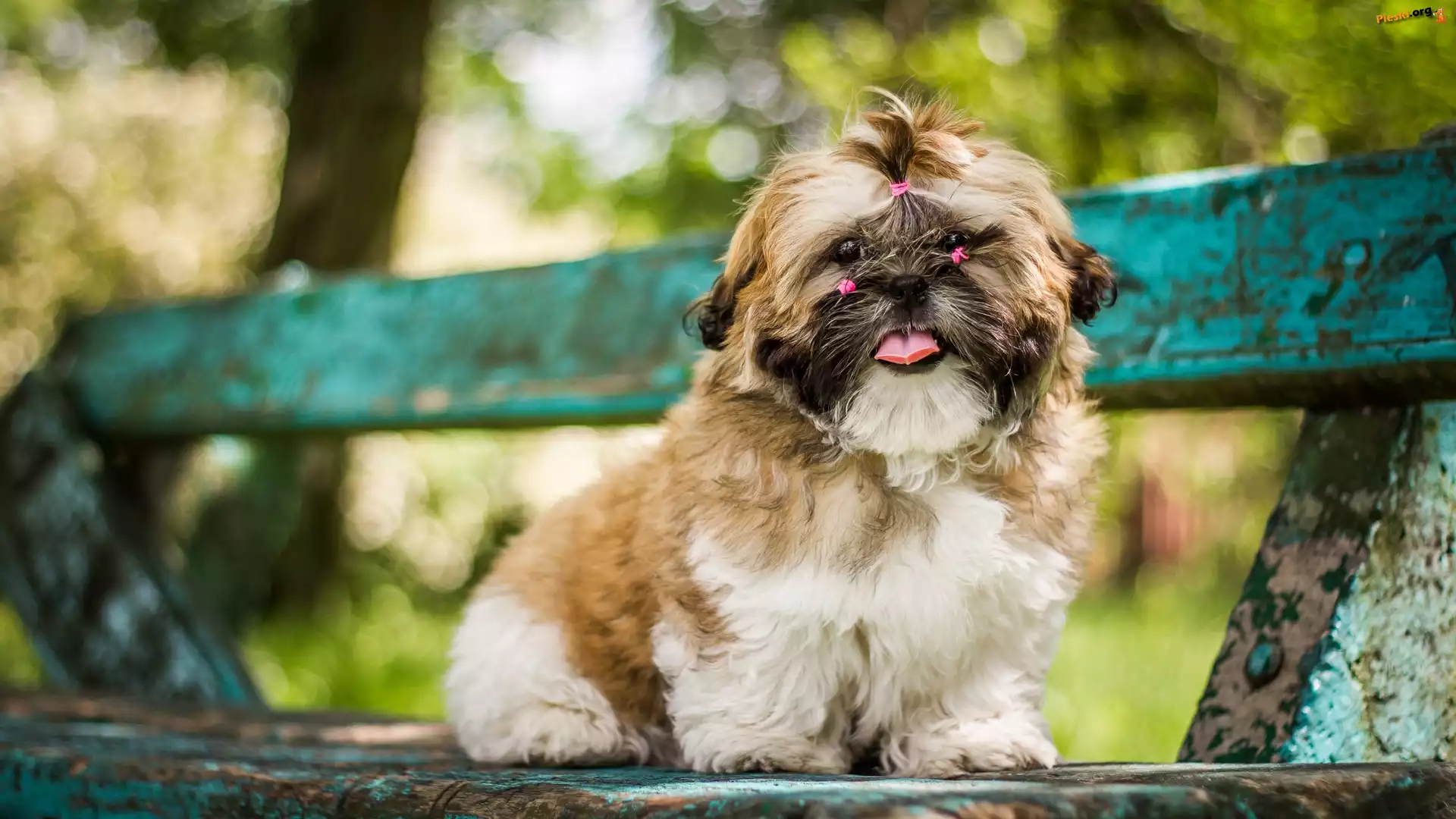 Pies, Gumki, Różowe, Shih tzu, Szczeniak, Ławka, Pieski