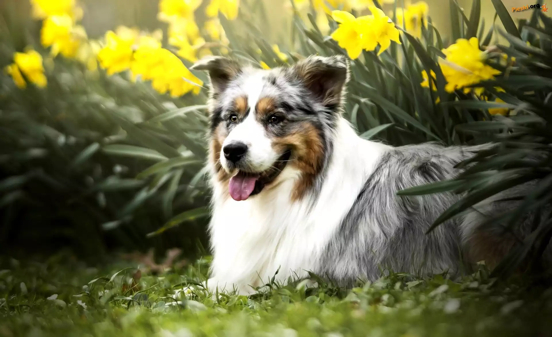 Kwiaty, Pies, Owczarek australijski, Żonkile