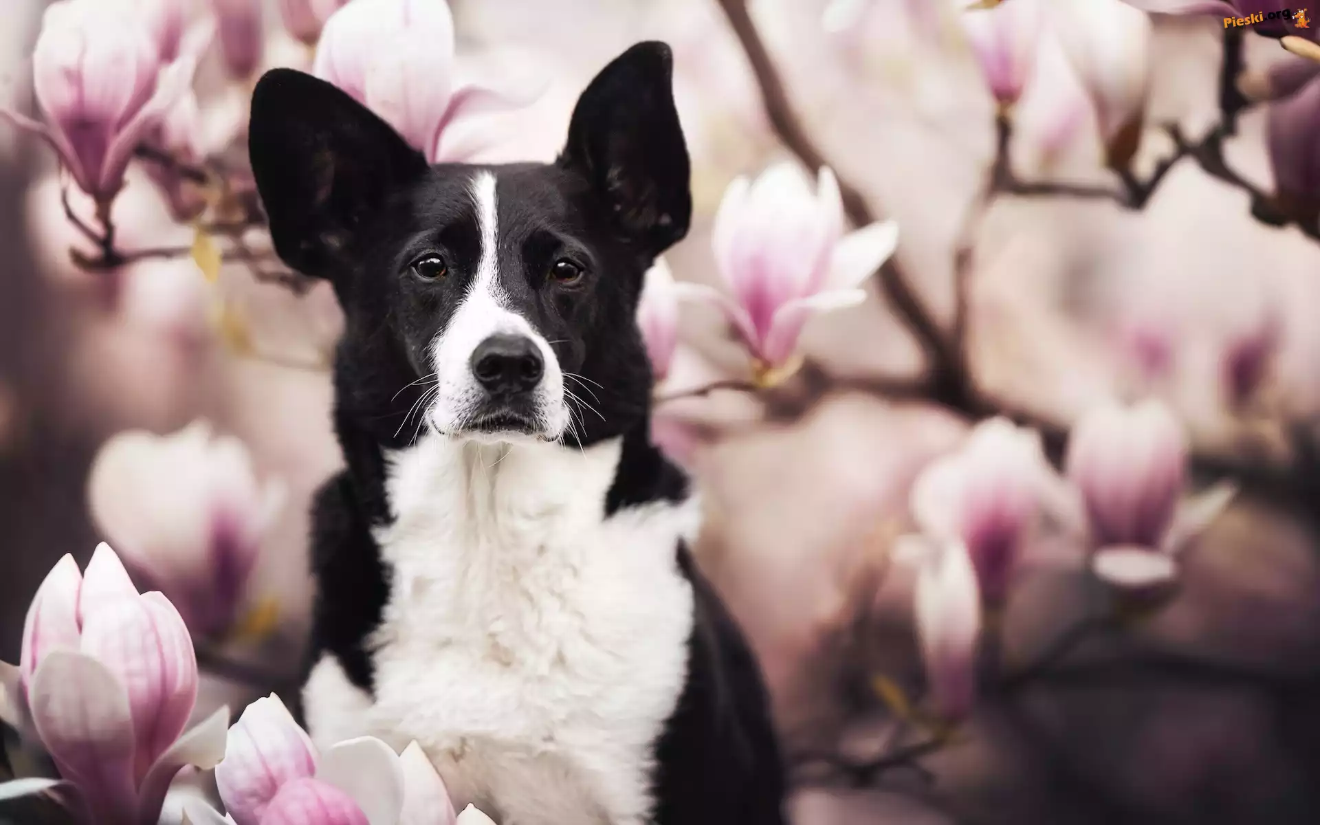 Magnolie, Kwiaty, Pies, Border collie, Pieski