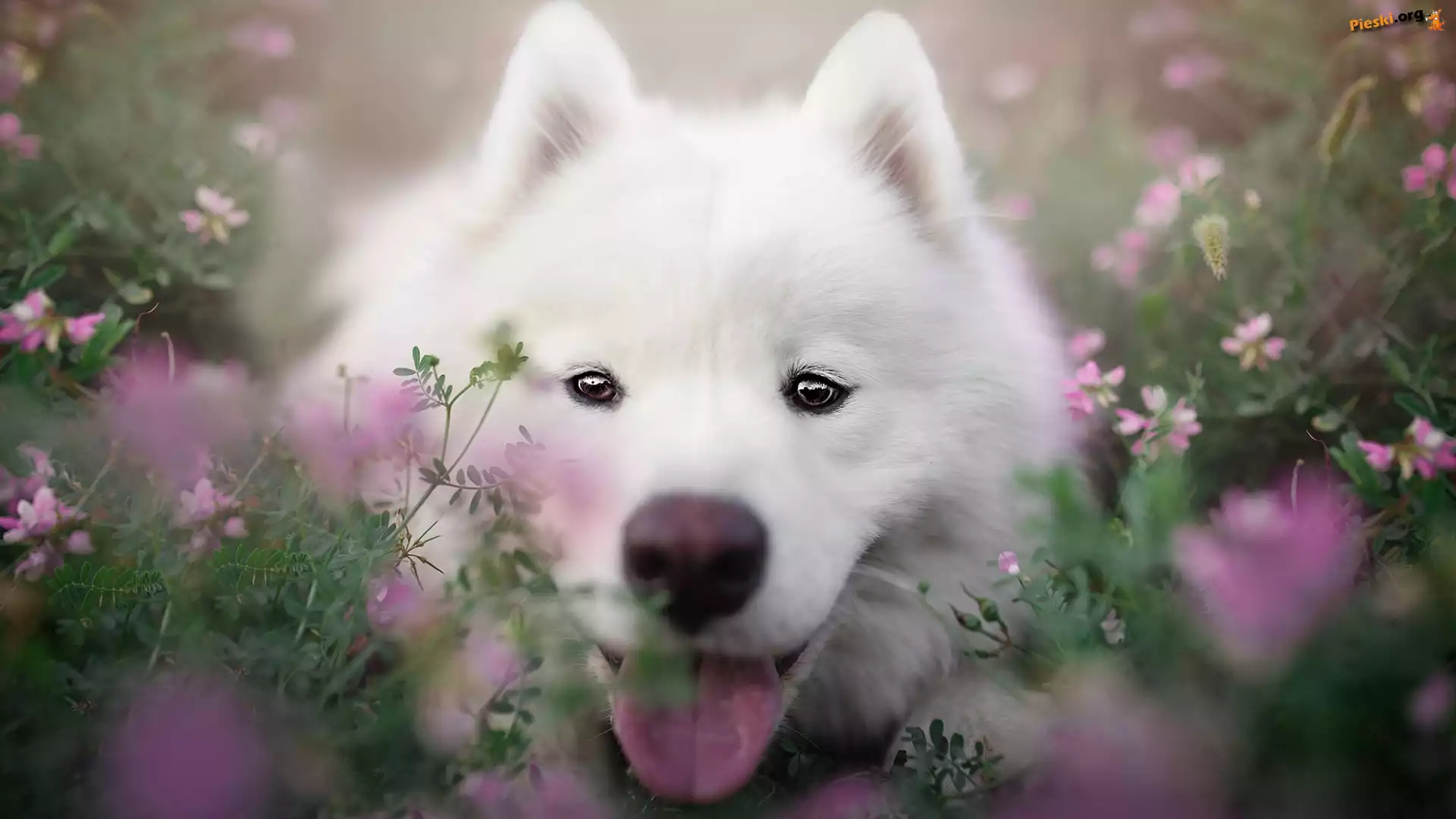 Kwiaty, Pies, Biały, Samojed, Zbliżenie, Pieski