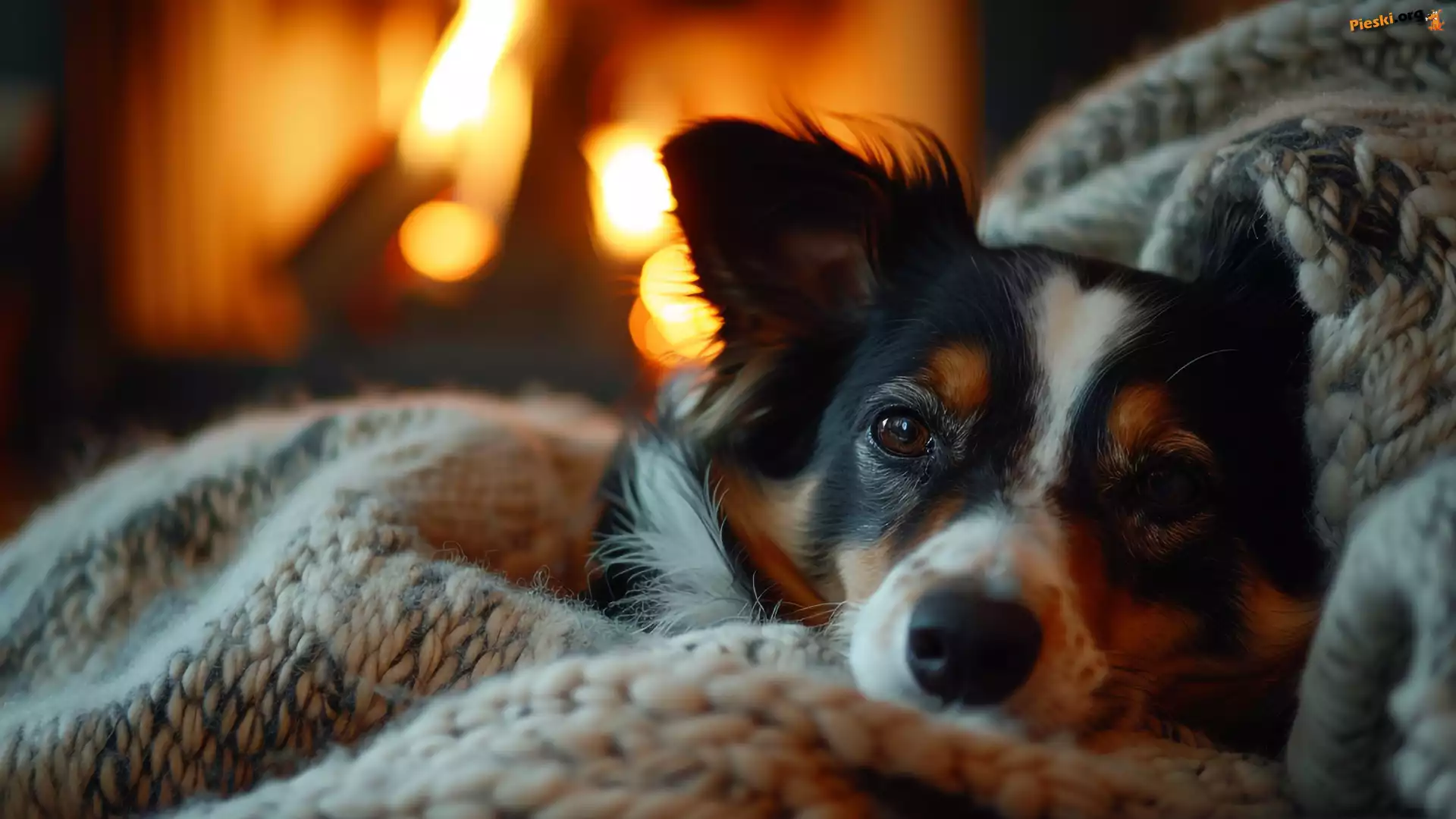 Płomień, Pies, Mordka, Leżący, Kominek, Koc, Pieski