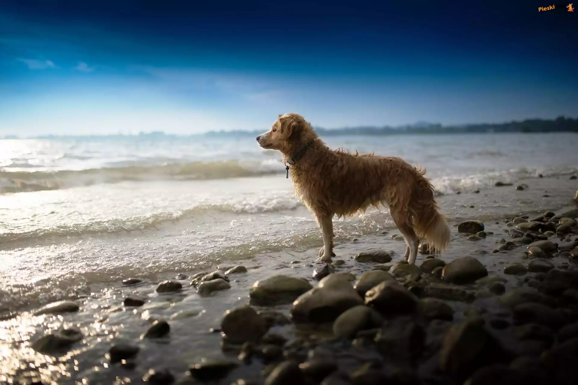 Morze, Świt, Pies, Kamienie, Fale, Oczekiwanie, Pieski