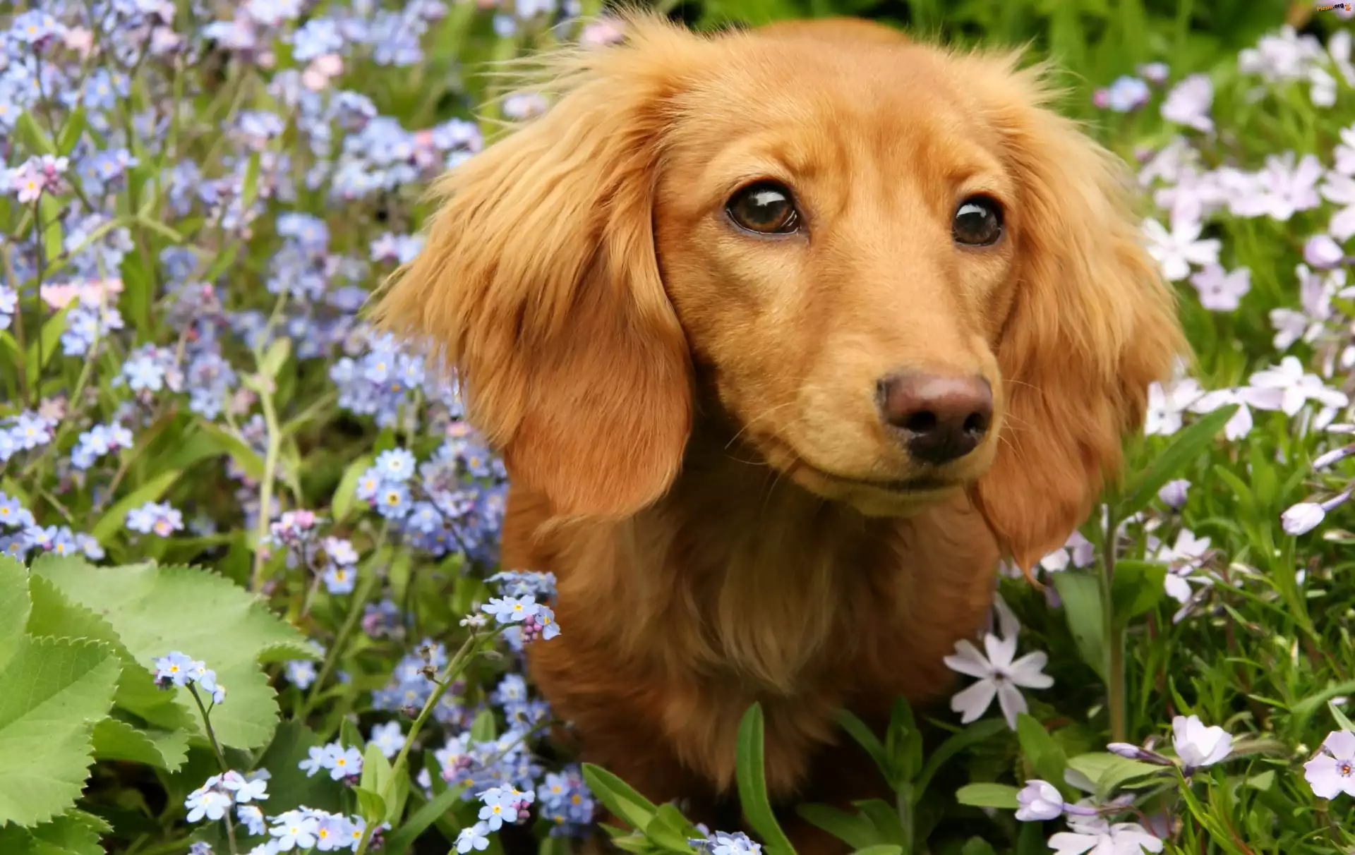 Niezapominajki, Jamnik, Łąka, Wiosna, Pieski