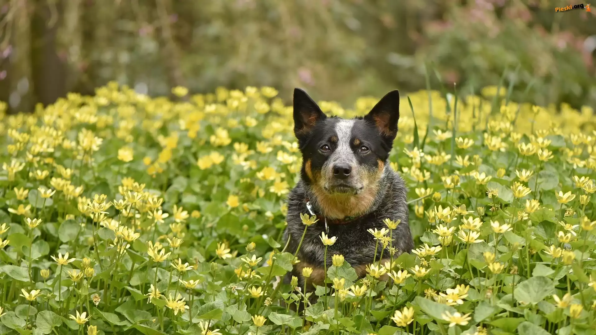 Żółte, Australian cattle dog, Pies, Łąka, Kwiaty