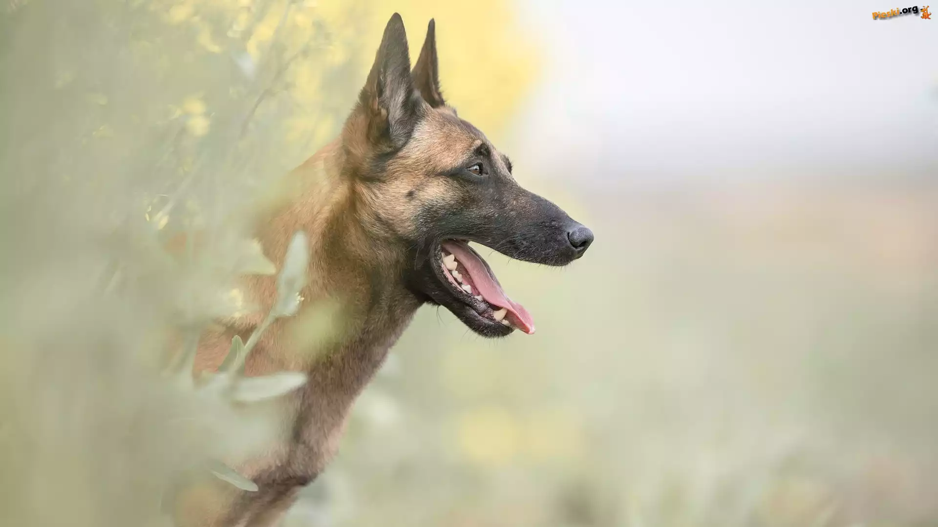 Owczarek belgijski Malinois, Pies, Mordka, Kwiaty Ptak, Syczek zwyczajny, Pies, Sowa, Owczarek belgijski Malinois Wrzosy, Pies, Rozmyte, Mordka, Owczarek belgijski malinois, Jęzor, Tło
