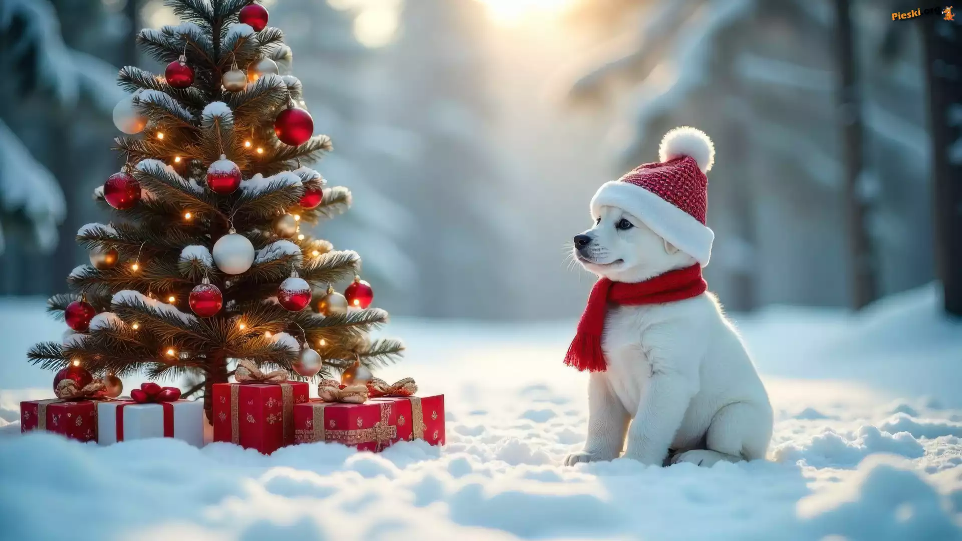 Choinka, Zima, Pies, Prezenty, Boże Narodzenie, Biały, Szczeniak