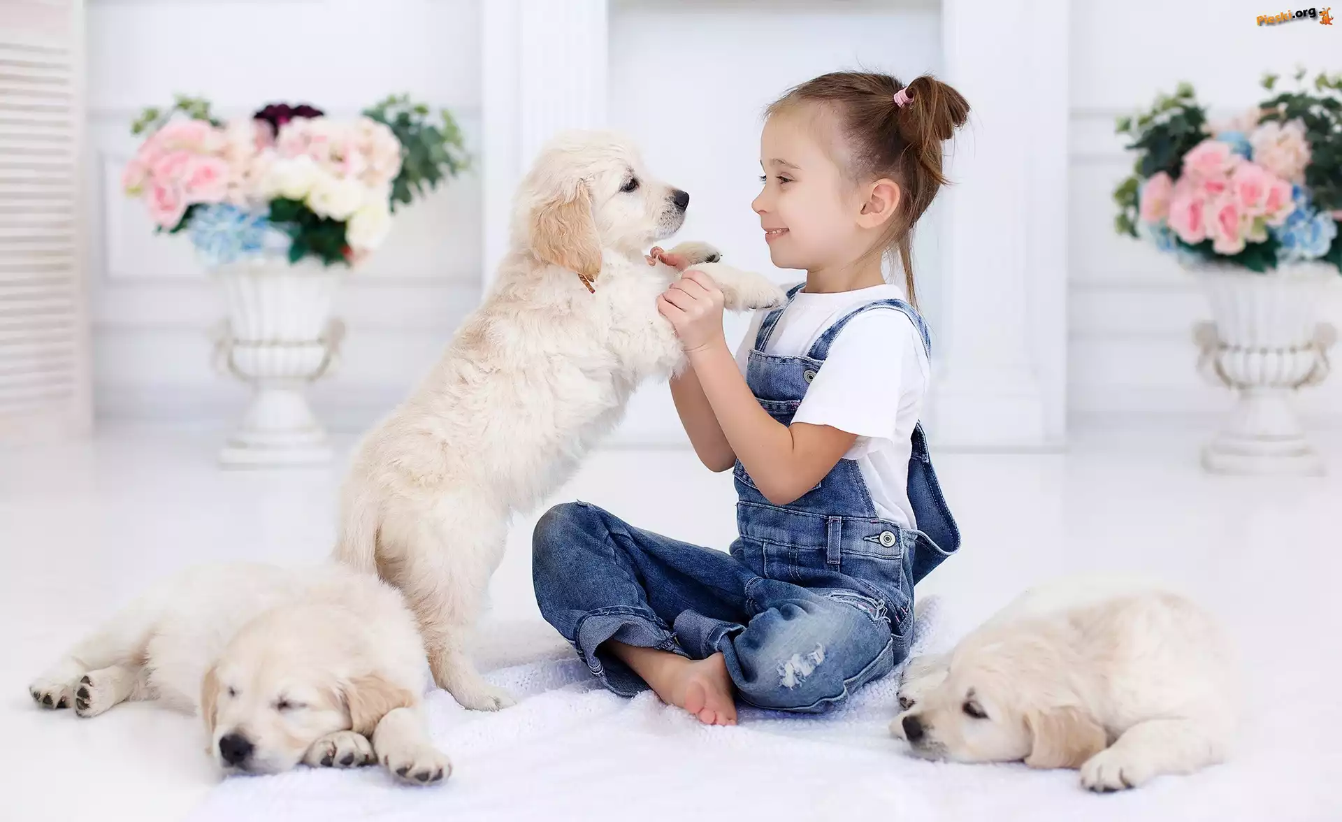 Szczeniaki, Dziewczynka, Trzy, Golden retrievery, Pieski