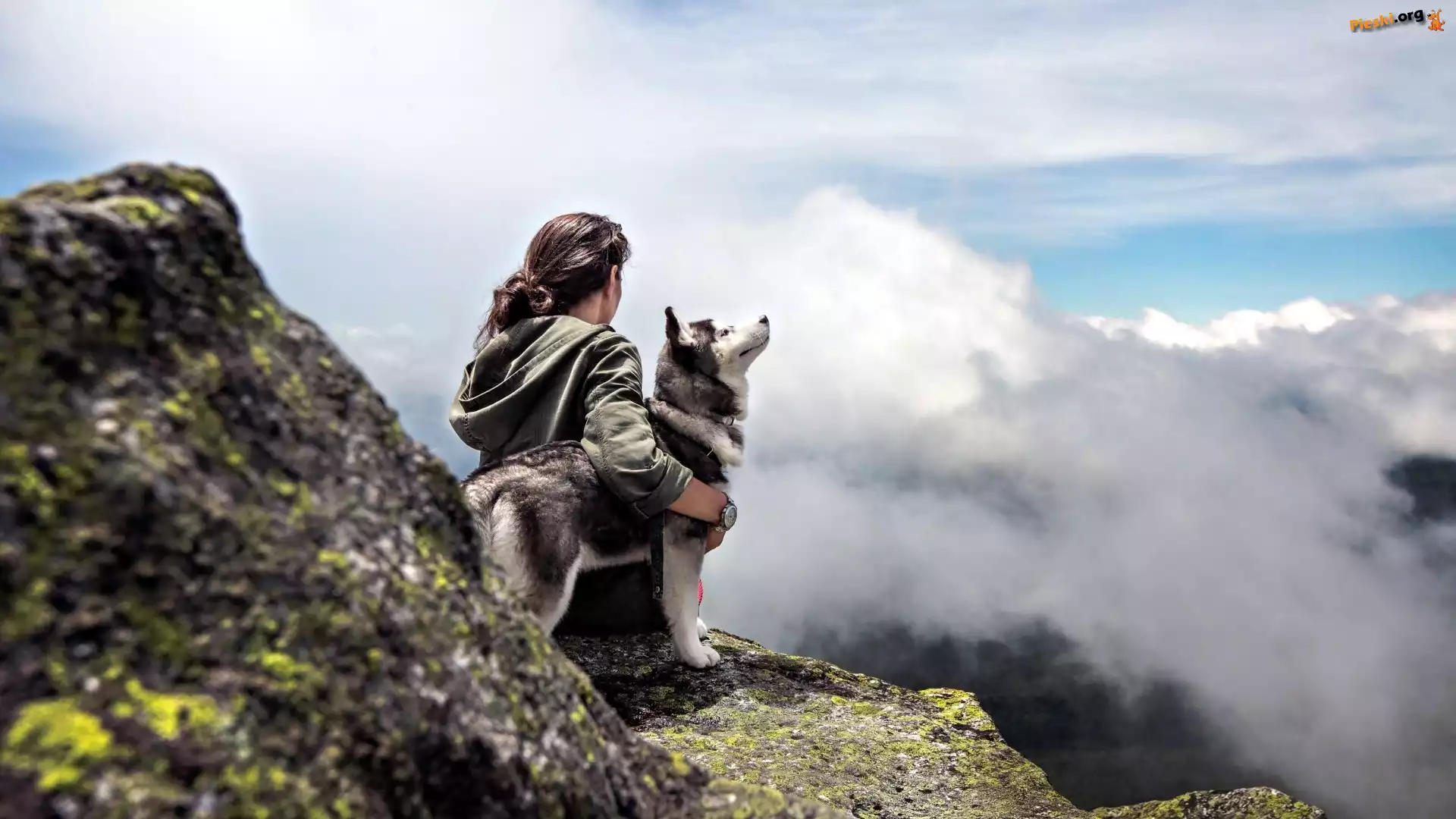 Szczyt, Pies, Dziewczyna, Góry, Mgła, Pieski