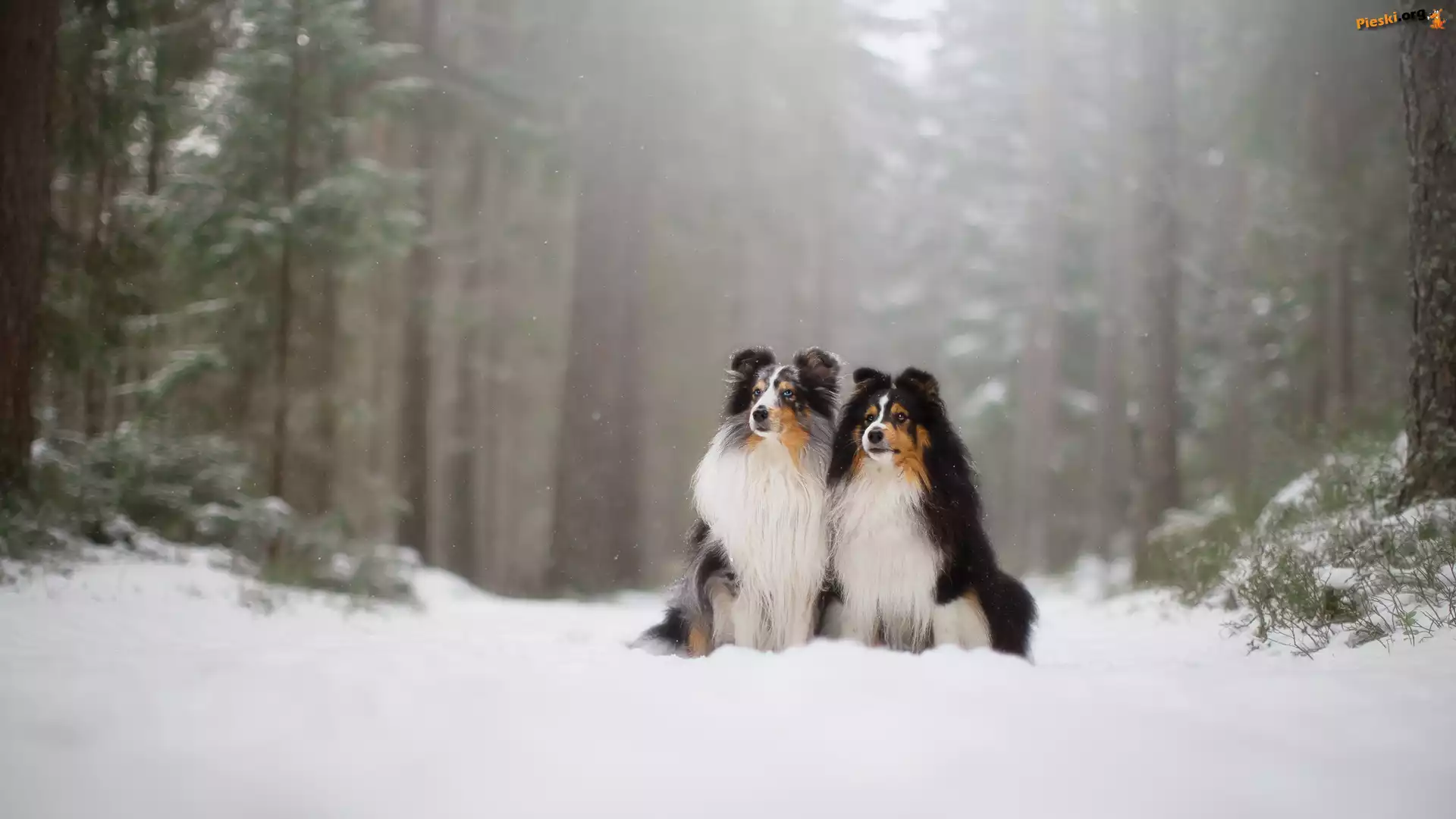 Śnieg, Psy, Owczarki szetlandzkie, Las, Pieski