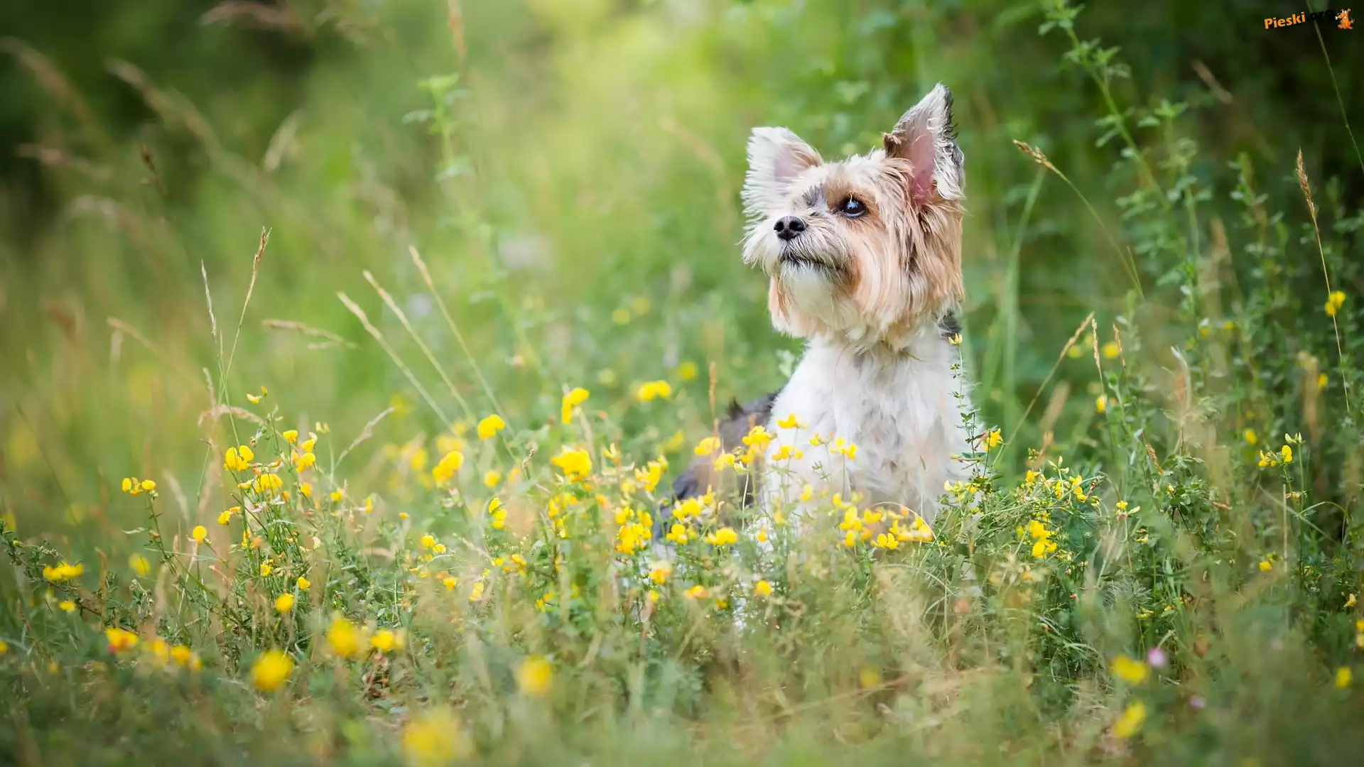 Żółte, Pies, Yorkshire terrier, Kwiaty