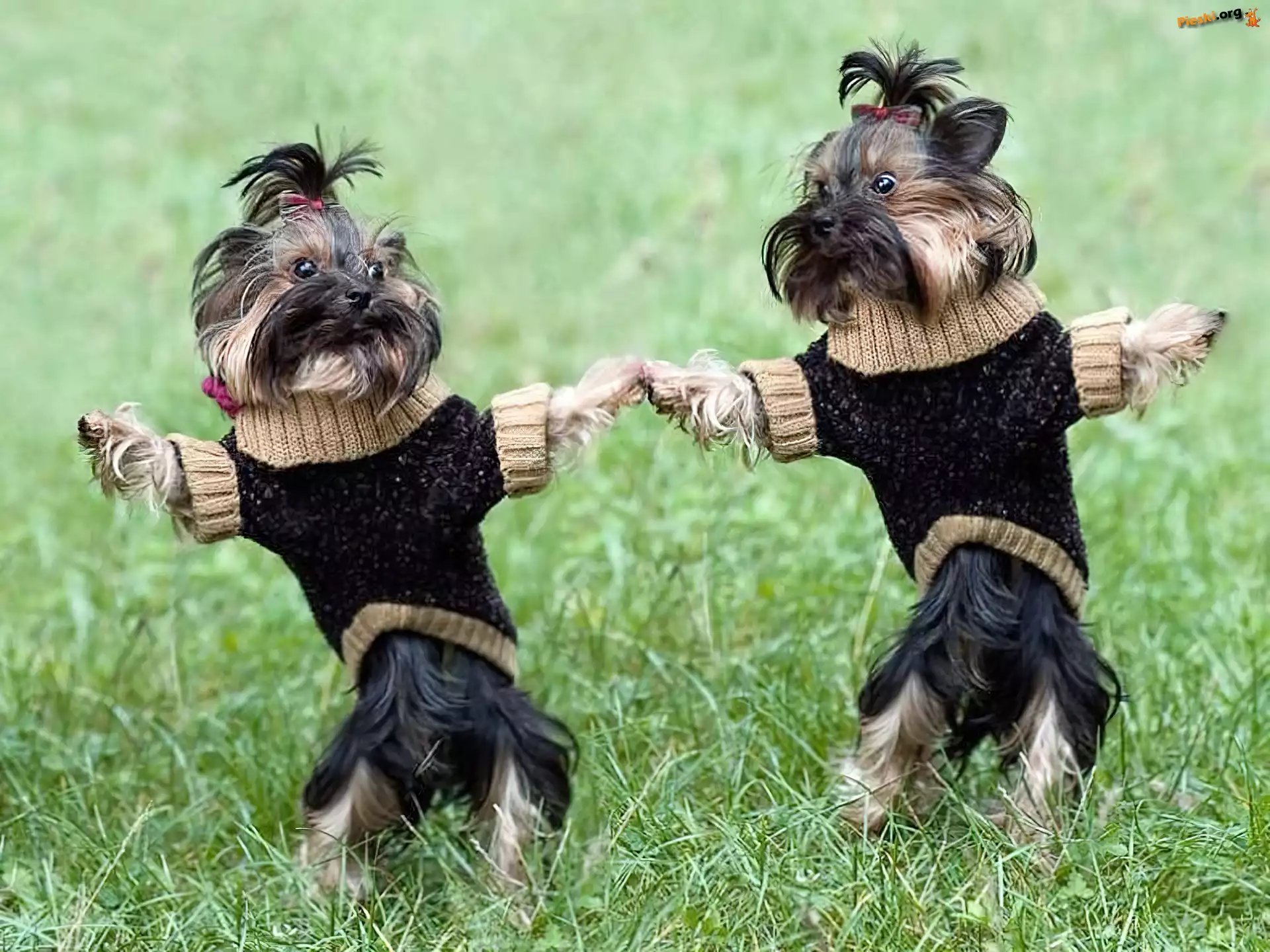 Łąka, Yorkshire, Terrier, Sweterki, Pieski