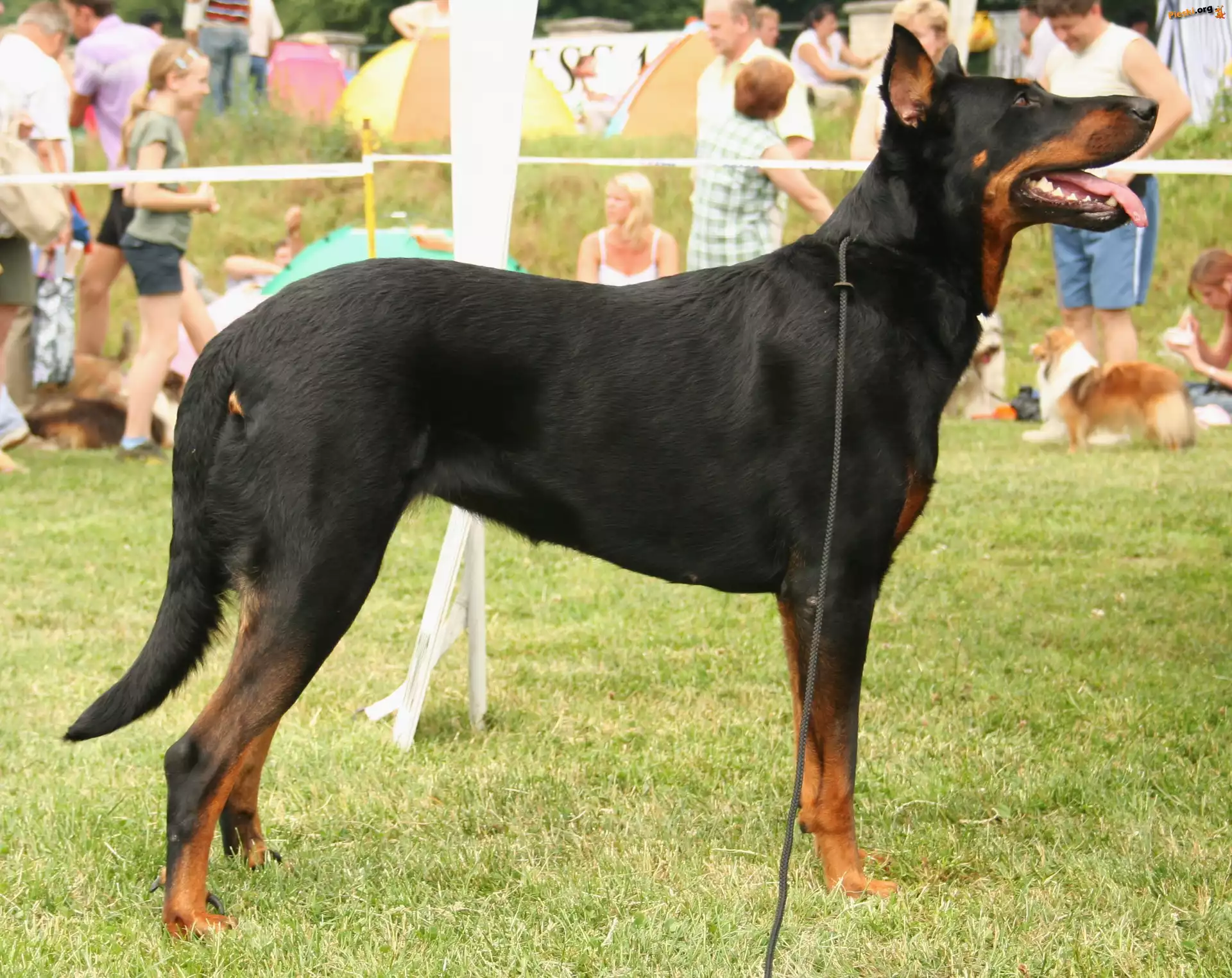 Beauceron, łapy Owczarki francuskie Beaucerony, czarne, Trzy Szczeniaki, Owczarka francuskiego Beaucerona Beauceron, obroża, łańcuch Dwa, Owczarki francuskie Beauceron tylna, pazur, podwójny, Beaucerona, łapa Owczarek francuski Beauceron, woda Pies, Trawa, Ludzie Owczarek francuski Beauceron, jęzor, kij Dwa, leżące, Beaucerony Owczarek francuski Beauceron, kamienie trawa, soczysta, Beauceron Młody, Owczarek francuski Beauceron Beauceron
