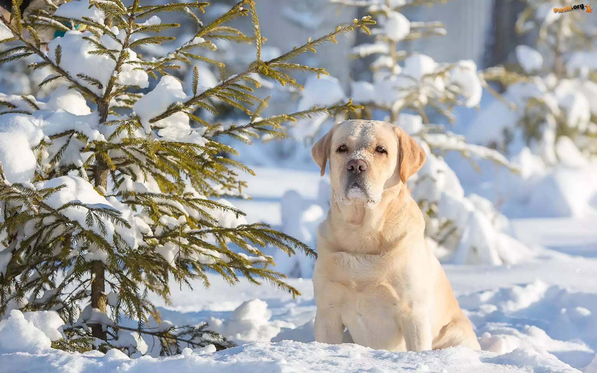 Zima, Retriever, Labrador, Śnieg, Iglaki, Pieski